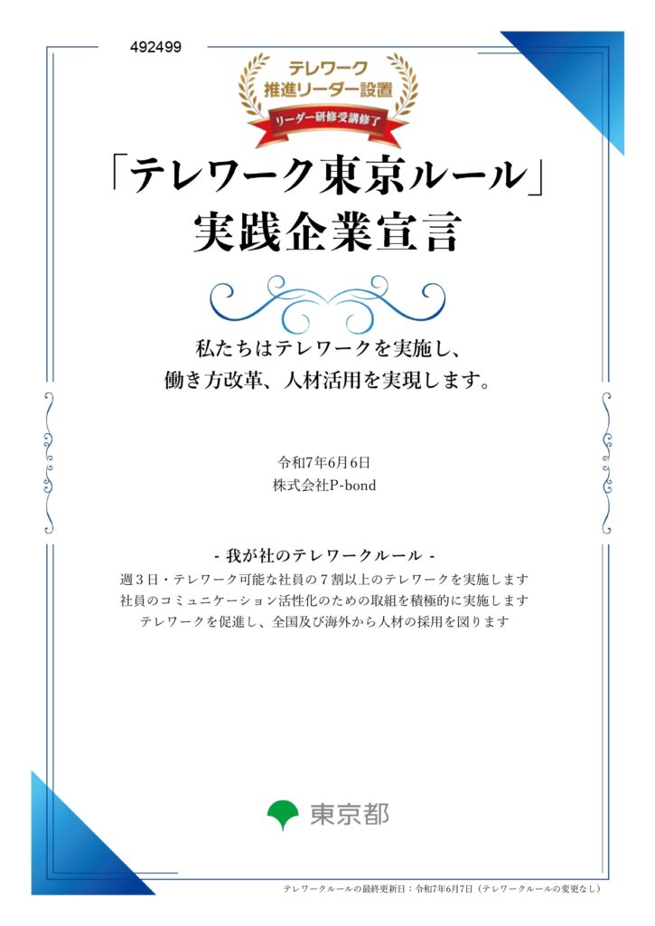 「テレワーク東京ルール」実践企業として、テレワークルール(我が社のベストバランス)を掲げ、テレワーク定着に向けた取り組みを行っています。